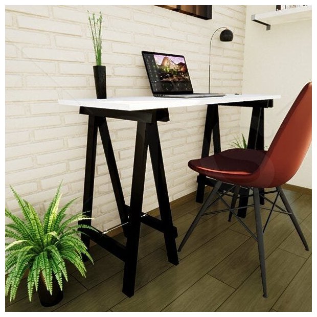 Escrivaninha na cor branca fabricada com MDP 15mm com reforço nas bordas chegando a 30mm de espessura na medida de 60cm de profundidade por 1,20m de largura, com par de cavaletes prático dobrável em madeira maciça na cor preta, dando praticidade e usabilidade ao móvel. Utiliza-se em vários lugares e necessidades funcionando como, bancada de serviço, jardinagem, Escrivaninha para escritório, excelente para seu trabalho home office. Organização, praticidade e decoração em um só produto, se adequando a qualquer ambiente com usabilidade, o seu home office prático.