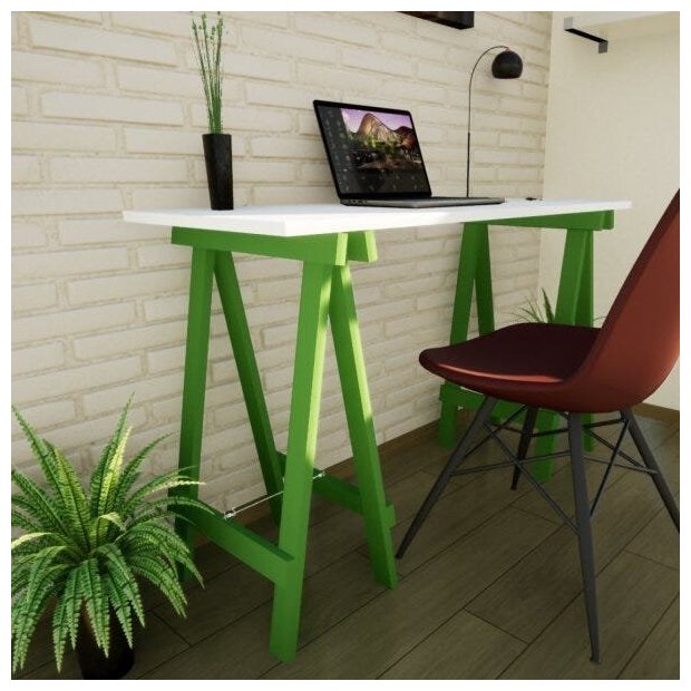Escrivaninha Prática MDP Branco e Cavaletes Verde Fabricada com MDP 15mm Branco com reforço nas bordas chegando a 30mm de espessura na medida de 60cm de profundidade x 1,20m de largura, com par de cavaletes prático dobrável em madeira maciça na cor Verde Folha, dando praticidade e usabilidade ao móvel. Utiliza-se em vários lugares e necessidades funcionando como, bancada de serviço, jardinagem, Escrivaninha para escritório, excelente para seu trabalho home office. Organização, praticidade e decoração em um só produto, se adequando a qualquer ambiente com usabilidade, o seu home office prático.