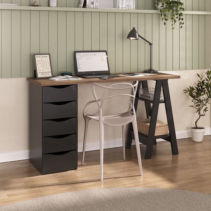 Escrivaninha Mesa Escritório com 5 gavetas e 2 prateleiras e Pés Cavalete Spirit Nogal/Preto