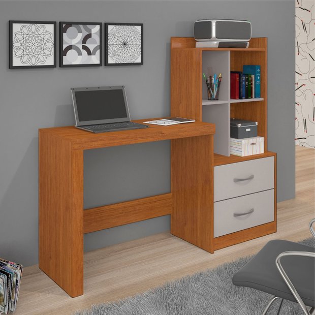 Escrivaninha Mesa Escritório com Estante Alana 2 Gavetas 4 Nichos 141cm Cinamomo E Off Cinamomo/Off White
