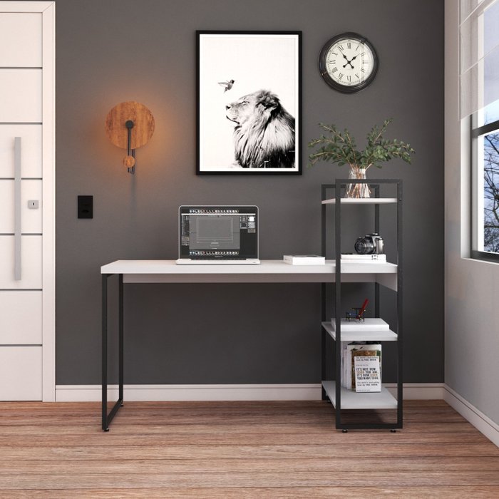 Escrivaninha Mesa Escritório com Estante Alta Estilo Industrial 135cm com 03 Prateleiras Dynamica Yescasa Branco Chess/Preto
