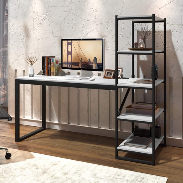 Escrivaninha Mesa Escritório com Estante Innovare 4 Prateleiras 170cm Industrial Preto/Branco
