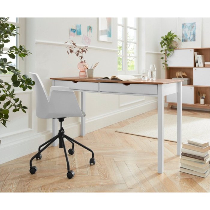 Escrivaninha Mesa Escritório de Madeira Maciça 2 Gavetas 140cm Coleção Gava Branco Lavado/Marrom Yucatán