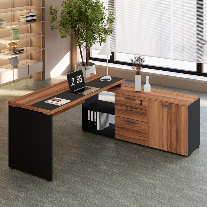 Escrivaninha Mesa Escritório Diretor em L Escrivaninha com Armário e Gavetas – Tampo Bicolor Yescasa Nogal Sevilha/Preto