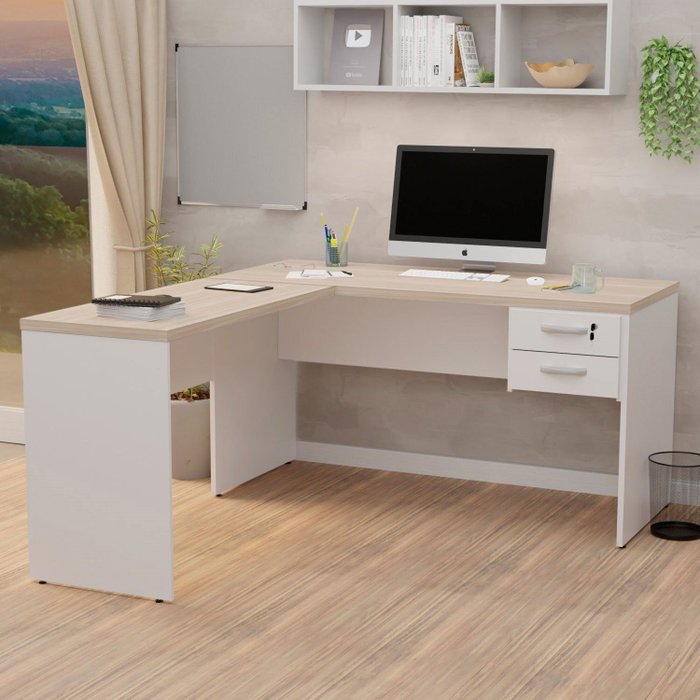 Escrivaninha Mesa Escritório em L 160x150cm com Gaveta Carvalho/Branco