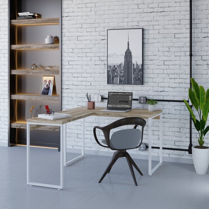 Escrivaninha Mesa Escritório em L Estilo Industrial 120x150cm Kuadra Carvalho/Branco