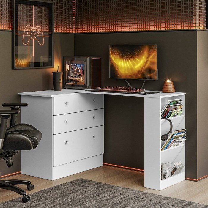 Escrivaninha Mesa Escritório em L Retrátil com Cômoda Módulos e Complementos Branco