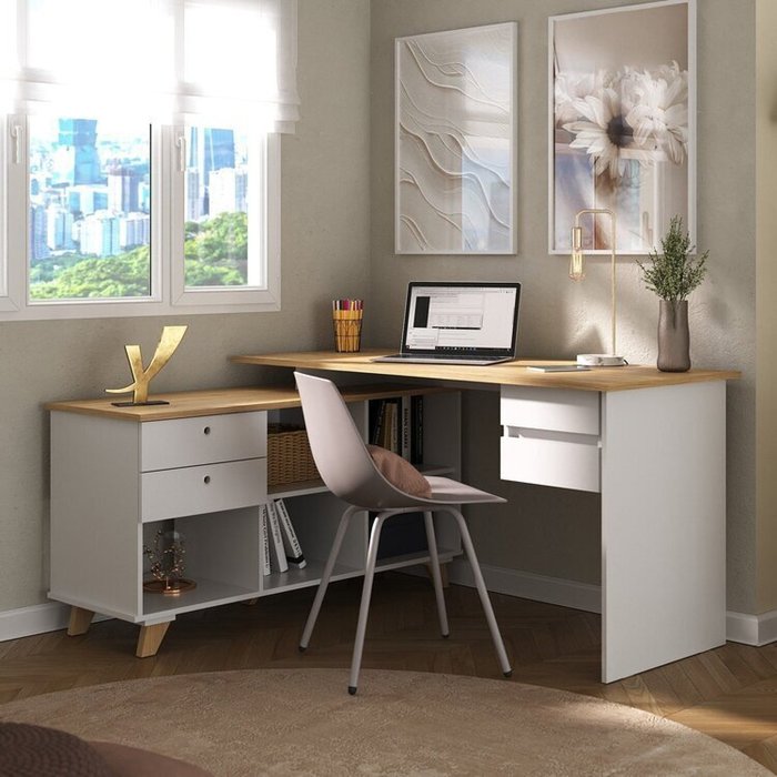 Escrivaninha Mesa Escritório em L Retrô Gold com 4 Gavetas Olmo/Branco