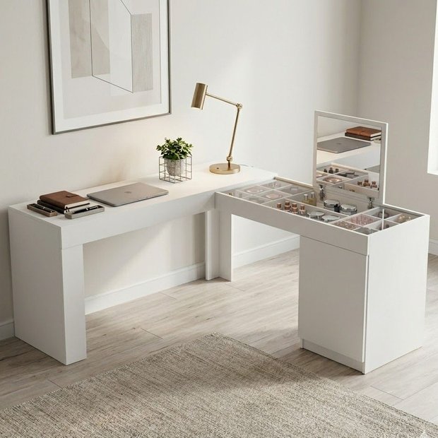 • Design Inteligente 2 em 1 Projetada para aproveitar perfeitamente os cantos do ambiente, esta mesa em formato "L" oferece uma superfície espaçosa. O grande diferencial é seu tampo com espelho, que se levanta para revelar um porta-objetos interno, ideal para guardar maquiagens, joias e acessórios, transformando-a instantaneamente em uma penteadeira funcional.