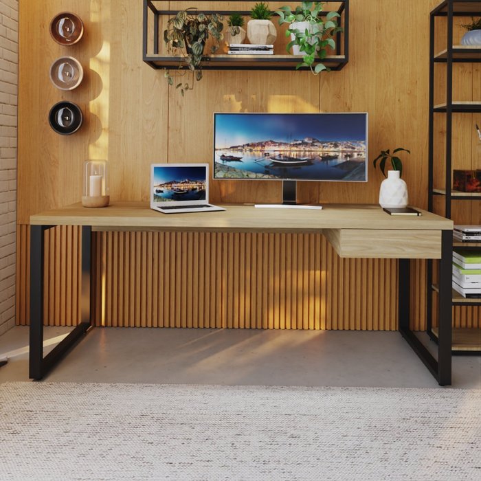 A mesa Yon YOME71901G possui dimensões generosas, combinando funcionalidade com o design industrial. O tampo desta mesa é engrossurado em 40mm e as bordas possuem acabamento em fita de PVC de 01mm, proporcionando durabilidade e uma superfície muito resistente. Os pés são feitos em tubos de aço 30x50mm, conferindo estabilidade, robustez e uma imponente qualidade. A gaveta com corrediças telescópicas oferece praticidade e organização e sua combinação de materiais e proporções bem pensadas a tornam uma opção de escolha versátil e elegante para ambientes corporativos ou home offices.