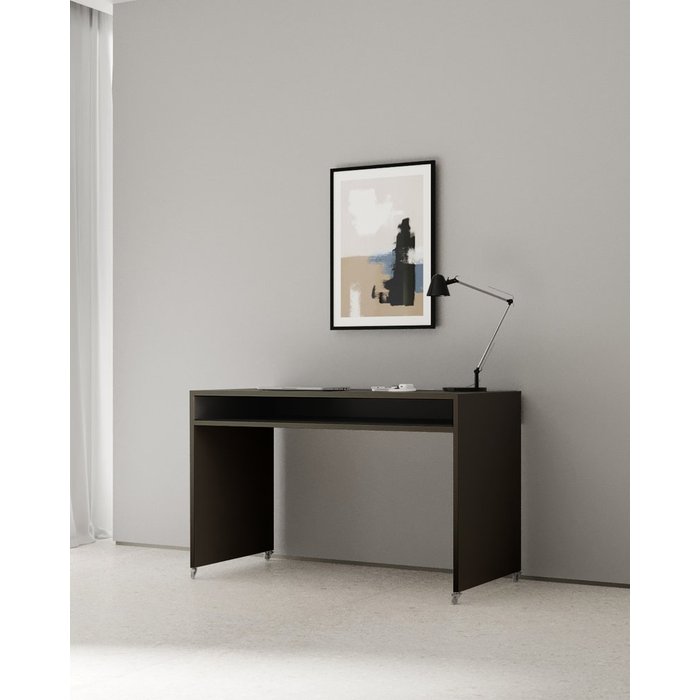 Escrivaninha com design minimalista e básico, se integra a todo tipo de ambiente de trabalho. Feito em mdf e melamina preta, materiais de qualidade e durabilidade. Com rodinhas.