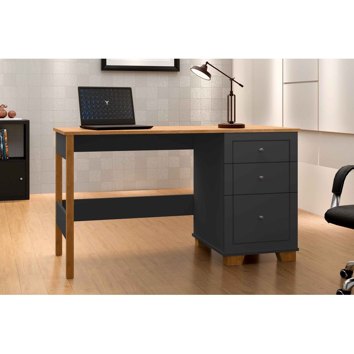 Escrivaninha Office 136cm 3 Gavetas Pés em Madeira Fenix Rede Móveis Preto/Nature