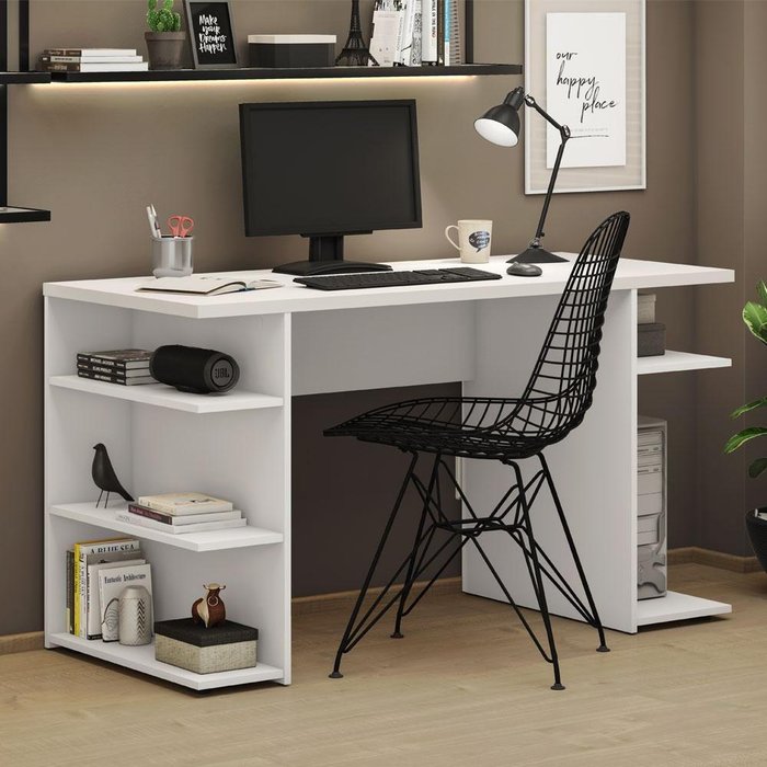 O tampo é super amplo, reforçado e seguro. Além disso, na parte lateral, a mesa conta com várias prateleiras e nichos, assim você pode organizar também aquela decoração que não pode faltar.