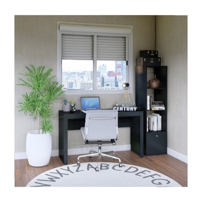 Home Office composto por uma escrivaninha com vistas frontais caracterizando o design moderno e uma estante organizadora que é perfeita para organizar e decorar seu ambiente. Desenvolvida 100% em MDP revestido por 7 camadas de tinta na sua impressão UV conferindo beleza, durabilidade e resistência. Produto de fácil montagem e flexível para ambientar diferentes espaços.