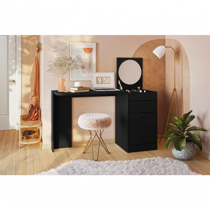 Escrivaninha Penteadeira Camarim Desejo Preta Albatroz Preto Com dupla funcionalidade a Escrivaninha Penteadeira Camarim desejo veio para facilitar e organizar seu dia a dia. Ela é feita em MDP de 15 mm, com tampo de 25 mm com canto arredondado, que garante maior qualidade e durabilidade. Ele tem uma porta e uma gaveta com corrediça telescópica, que oferecem espaço para guardar seus objetos e acessórios. Ele também possui uma porta basculante com pistão a gás, com um espelho redondo de 0,35 m de diâmetro.