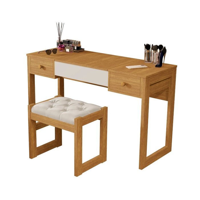 Escrivaninha Penteadeira com Espelho e Banqueta Luanda Fenix:cinamomo/off White