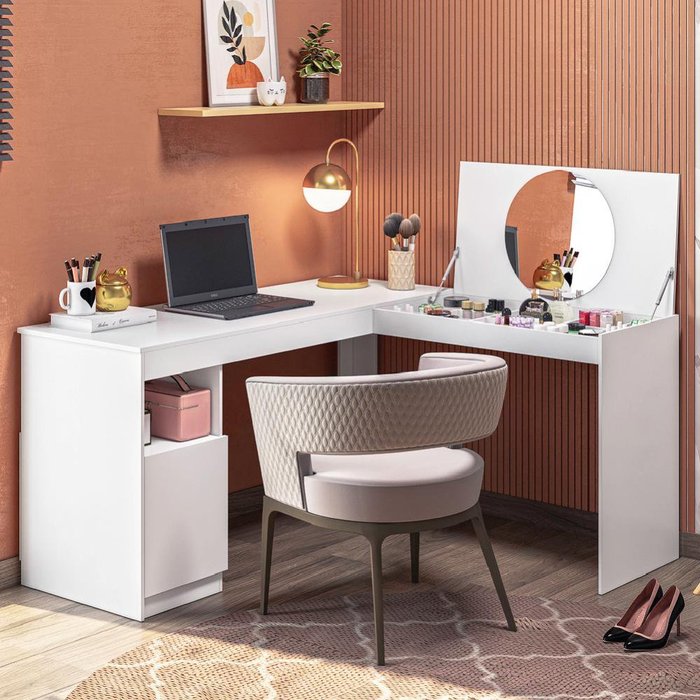 Escrivaninha Penteadeira de Canto com Espelho 1 Porta Burguesa Branco Fiorello Branco