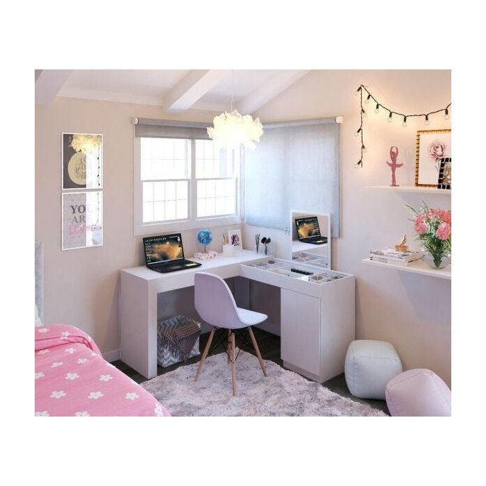 A Escrivaninha de canto com penteadeira Love foi desenvolvida pensando em facilitar a organização de seus pertences de maquiagem e beleza.Produzida em MDP com acabamento em pintura UV.