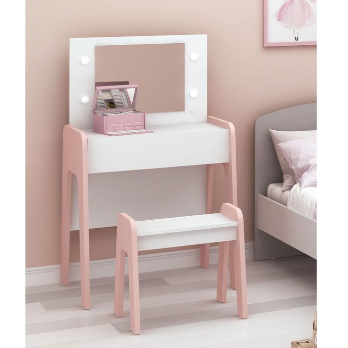 Escrivaninha/Penteadeira Infantil Ternura com Led e Banqueta - Branco/Rosa
