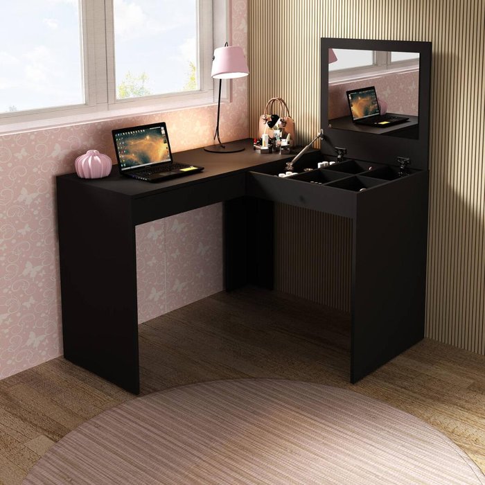 Descubra a combinação perfeita entre funcionalidade e elegância com a nossa Escrivaninha/Penteadeira de Canto 110cm com Espelho e 1 Gaveta Multimóveis CR40119, que transformará seu ambiente no cantinho da beleza dos sonhos. Com formato em "L" e produzida em MDP de 15mm, ela oferece resistência e durabilidade excepcionais. A opção na cor branca possui acabamento em pintura UV, enquanto a cor preta possui um toque refinado em BP. Com 1 porta basculante equipada com pistão e espelho de vidro (3mm), você pode acomodar joias, acessórios e maquiagens de forma organizada e prática. A gaveta com corrediças metálicas (maior leveza no manuseio) é perfeita para seus itens essenciais do dia a dia. Além disso, o tampo suporta até 15kg, ideal para apoiar notebook e outros objetos.