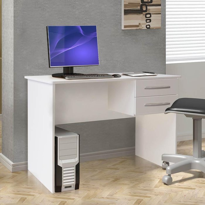 Este móvel geralmente possui uma superfície plana, com uma ou mais gavetas para armazenar materiais de escritório, livros e outros itens essenciais.