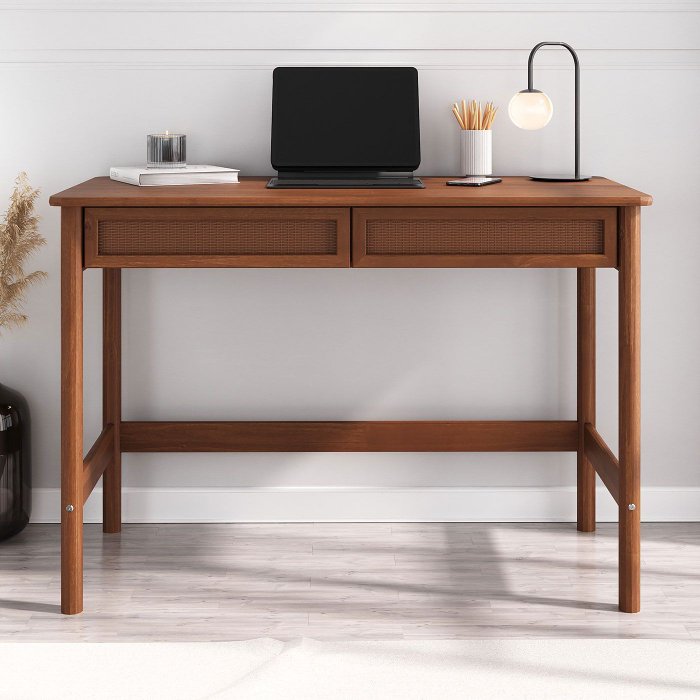 A Escrivaninha Rattan Madeira Rodrigo 2 Gavetas é produzida em madeira maciça, oferece amplo espaço útil no tampo, ideal para acomodar materiais de trabalho, estudo ou decoração.