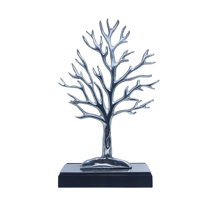 Escultura árvore produzida em alumínio, sob uma base retangular de madeira. Possui um design autêntico e moderno, com elementos vazados e formato modesto, que encanta pela leveza, trazendo significados de conhecimento, evolução e estabilidade.