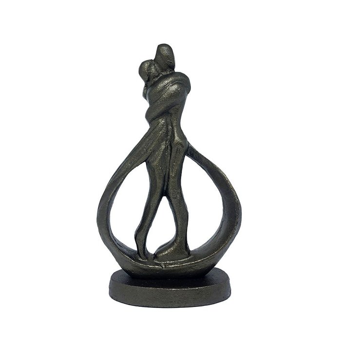 Escultura produzida em alumínio de casal se abraçando com acabamento na cor ouro velho, em um design que traz a ideia de envolvimento.
