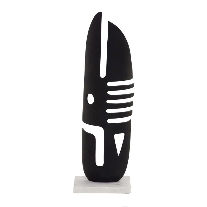 Escultura Decor Tribal em Metal Preto e Marmore Branco 48cm