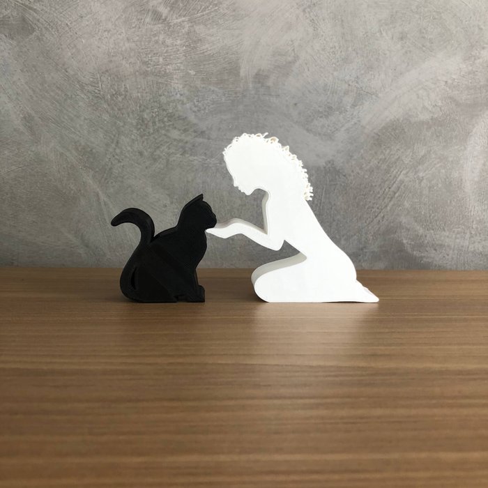 Escultura Decorativa Menina e seu Gato Pequena Vegras Cacheado Branco
