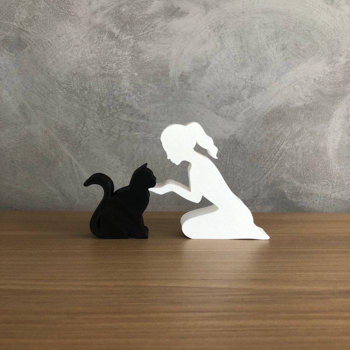 Escultura Decorativa Menina e seu Gato Pequena Vegras Preso Branco Branco