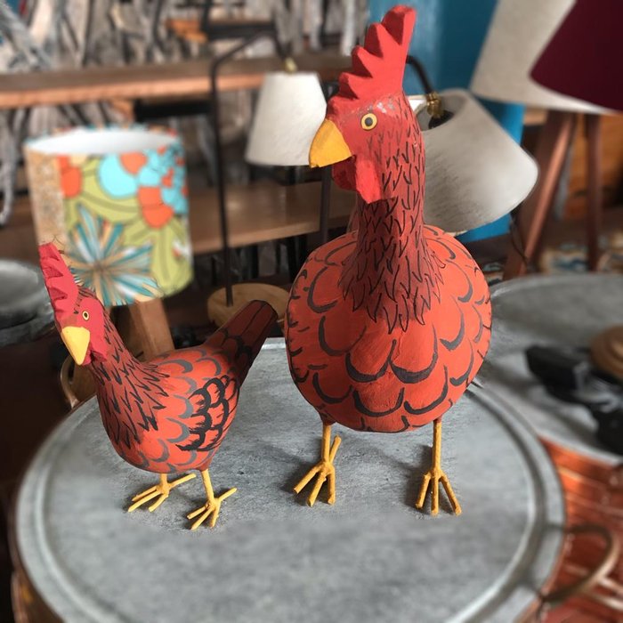 Galinha e pintinho em madeira pintados à mão coloridos tamanho real. Peso: 1000 gramas o jogo. Medidas(altura x largura): Galinha: 30x28x12 cm Galo: 20x18x7 cm