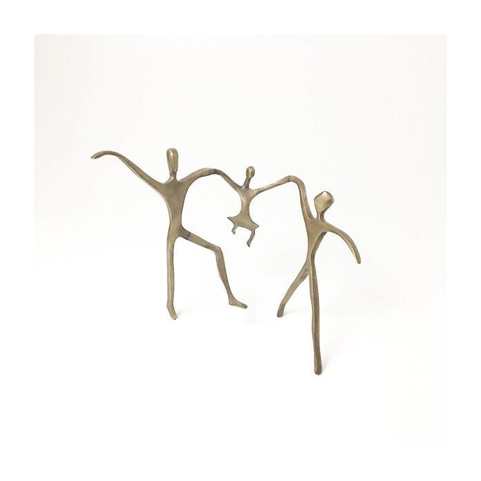 Escultura passeio em ferro, representa a figura de um casal segurando uma criança no alto, pelas mãos. Os personagens adultos compõem as extremidades e apenas estes tocam a base.