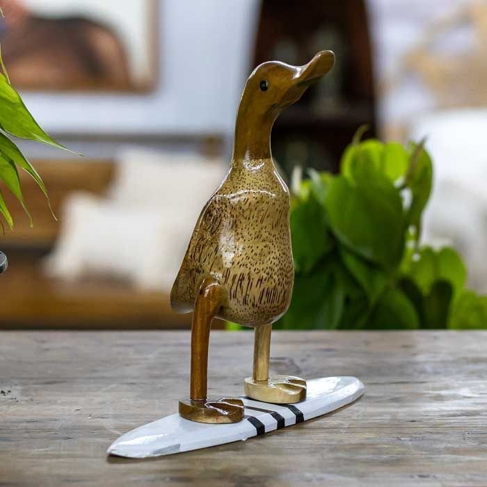 Escultura Pato Surfista em Bambu Importado de Bali - 25cm