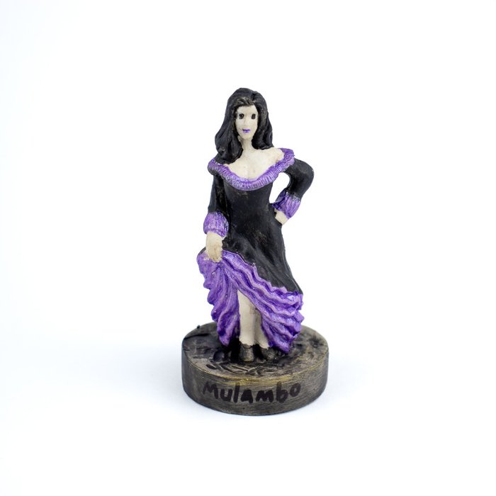 Feita em resina de alta qualidade, esta escultura de 10 cm apresenta detalhes impressionantes, pintados à mão, que capturam a essência e beleza de Maria Mulambo.
