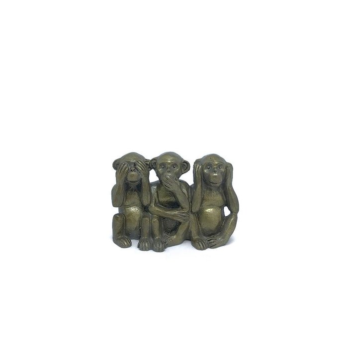 Mini escultura em resina com acabamento dourado, composta por três macacos sábios. A primeira figura é representada cobrindo os olhos, a segunda cobrindo os ouvidos e a terceira cobrindo a boca. O significado da liguagem corporal é respectivamente não ver, não ouvir e não falar o mal, como uma forma de se poupar.