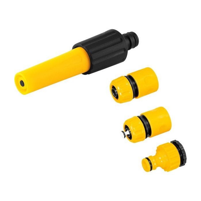 1 Esguicho plástico, acompanha: 1 engate rápido com bloqueador, 1 engate rápido sem bloqueador e 1 conector plástico de 3/4" com redução para 1/2"