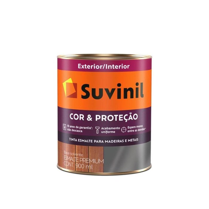 O Esmalte Suvinil Cor e Proteção Base Solvente 900ml é a escolha perfeita para quem busca um acabamento acetinado de alta qualidade e durabilidade. Ideal para quem deseja realçar a beleza de diversos objetos e superfícies, este esmalte é uma solução prática e eficiente para garantir proteção e sofisticação.Benefícios Acabamento Acetinado: Proporciona um toque sofisticado e uma reflexão suave da luz, enriquecendo a decoração dos ambientes. Alta Durabilidade: Com garantia de até dez anos, este esmalte assegura uma pintura resistente e duradoura, desde que aplicado corretamente. Excelente Cobertura: Sua formulação permite uma cobertura eficiente, reduzindo a necessidade de múltiplas demãos e otimizando o uso do produto. Fácil Aplicação: Desenvolvido para facilitar o processo de pintura, garantindo um acabamento uniforme e sem descascamento.Características e Diferenciais Resistência ao Desgaste: Protege superfícies contra intempéries, mantendo a pintura impecável por mais tempo. Versatilidade: Adequado para diversos tipos de superfícies, incluindo metais, madeiras e alvenaria. Secagem Rápida: Permite uma rápida finalização do trabalho, com toque seco em poucas horas.Especificações Técnicas Tipo de Produto: Esmalte Sintético Base: Solvente Acabamento: Acetinado Embalagem: Lata de 900ml Rendimento: Até 16 m² por demão, dependendo da superfície e da diluição Aplicação: Rolo, pincel ou pistola Secagem ao Toque: 1 a 3 horas Secagem Completa: 12 horas Diluição: Aguarrás, até 10%Perguntas Frequentes Posso usar este esmalte em áreas externas? Sim, o Esmalte Suvinil Cor e Proteção é adequado tanto para áreas internas quanto externas, desde que as instruções de aplicação sejam seguidas. Qual a melhor forma de preparar a superfície antes da aplicação? Certifique-se de que a superfície esteja limpa, seca e livre de poeira e graxa. Lixe suavemente e aplique uma base ou primer adequado se necessário. Esse esmalte é resistente a arranhões? Sim, o Esmalte Suvinil Cor e Proteção oferece alta resistência a arranhões e desgastes, mantendo a pintura bonita e protegida.