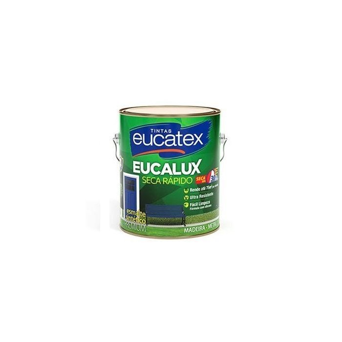Esmalte Fosco Premium Uso Especial Branco Galão 3,6 Litros Eucatex ALTO BRILHO, ALTA RESISTÊNCIA, SECA EM 30 MINUTOS. Eucalux Seca Rápido Esmalte Premium é indicado para aplicação em superfícies de madeira, metais ferrosos, alumínio, galvanizado e alvenaria. Sua fórmula inovadora permite uma secagem em até 30 min ao toque e ainda possui silicone que cria uma película com proteção prolongada para conservar o brilho e facilitar a limpeza.