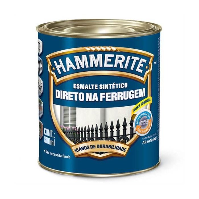 Tinta Esmalte Sintético Hammerite Brilhante Anti Ferrugem Branco 800ml – CORAL O Esmalte Sintético Hammerite Direto na Ferrugem é um esmalte antioxidante que se aplica diretamente sobre ferro limpo ou enferrujado. Não necessita de fundo prévio. Previne e interrompe o processo de ferrugem. Sua nova fórmula oferece uma Dupla Tecnologia: Alta Repelência a Água e Ação Anticorrosiva, além de permitir a diluição com aguarrás convencional, eliminando a necessidade de diluição com um solvente especifico. Possui um grande poder de cobertura e rendimento. Indicado para ambientes externos e internos. Aplicação Pincel sobre superfícies pequenas (como grades) e aplicação com rolo sobre superfícies grandes (como portões). Demãos: Pincel ou trincha: 2 a 3 demãos fartas. Rolo de lã/espuma ou pistola 3 a 4 demãos. Intervalo mínimo de 8 horas entre demãos. Diluição Aplicação a pincel: Não Diluir. Aplicação a rolo: Diluir na proporção até 10% com Aguarrás Coral. Aplicação a revolver: Diluir na proporção até 20% com Aguarrás Coral Acabamento Brilhante Secagem Ao toque: 1h a 2 hrs Entre demãos: 8hrs Final: 18 hrs Sobre ferrugem Não é necessário eliminar ou remover a oxidação fixada. Basta lixar a superfície para eliminação das partículas soltas. Repintura Lixar a superfície até remoção completa do brilho e partes soltas, lavar com água e sabão ou detergente neutro para eliminar o pó Enxaguar e aguardar secagem. Recomendamos fazer um teste antes em uma pequena área e esperar 1 hora. Se não ocorrer reação (enrugamento da película), realizar a pintura. Se ocorrer, remover a tinta velha e proceder como no caso de metal novo. Metal novo Lixar levemente, se necessário para melhor aderência.