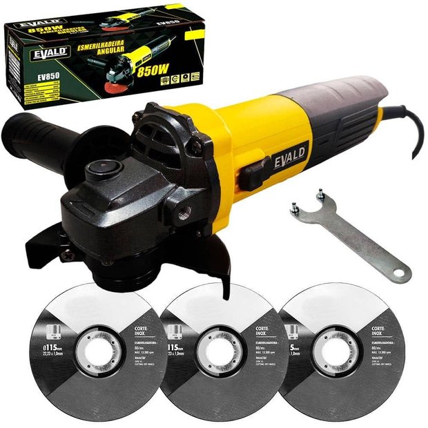 Esmerilhadeira Angular 4.1/2 POL 850W 115MM EV850 EVALD + Kit 3 Discos Esmerilhadeira angular conhecida como rebarbadora.