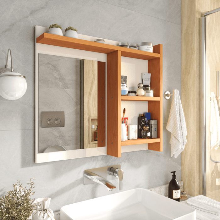 Espelheira de Banheiro Armarinho Organizador com Prateleira Nicho Nioki - Off White com Nature