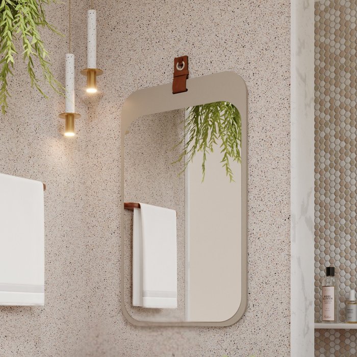 A espelheira Monet, é um produto moderno com design inovador e trará ao seu banheiro requinte e sofisticação, mostrará que você tem bom gosto. Destque para a chamosa alça em couro que permite pendurar a espelheira na parede.