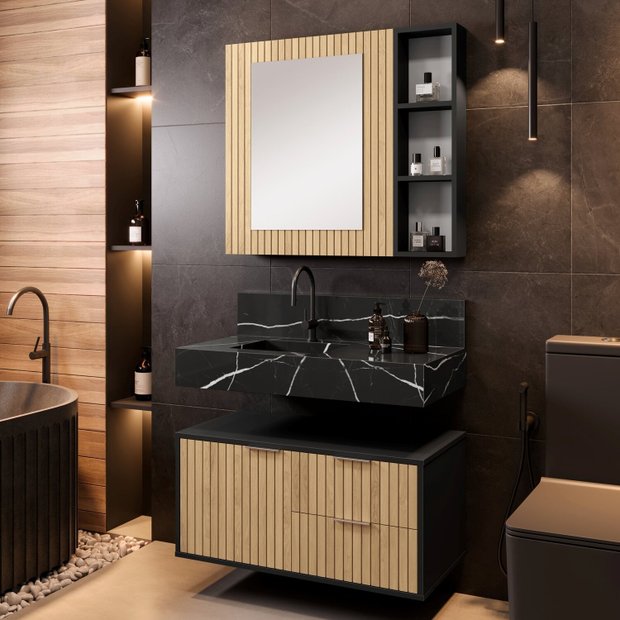 Espelho de 550 X 390 X 03 mm com acabamento lapidado, estruturado em porta com ripas AUTÊNTICAS de HDF BP (06mm). Possui prateleiras internas e porta com dobradiças slow, com sistema de amortecedor. Ao lado, acompanha Nicho de 20cm x 70cm, com prateleiras para maior organização. Acompanha tapa furos buchas de nylon parafusos para fixação na parede. Possui manual de instalação. Espelheira ideal para compor com os Armários e Gabinetes da marca BUMI MÓVEIS, e as Bancadas e Lavatórios da marca BLU LAVATÓRIOS (vide site do Madeira Madeira). Produto sai montado de fábrica, devidamente regulado, bastando apenas fixá-lo na parede. Garantia de 12 meses para defeito de fabricação.