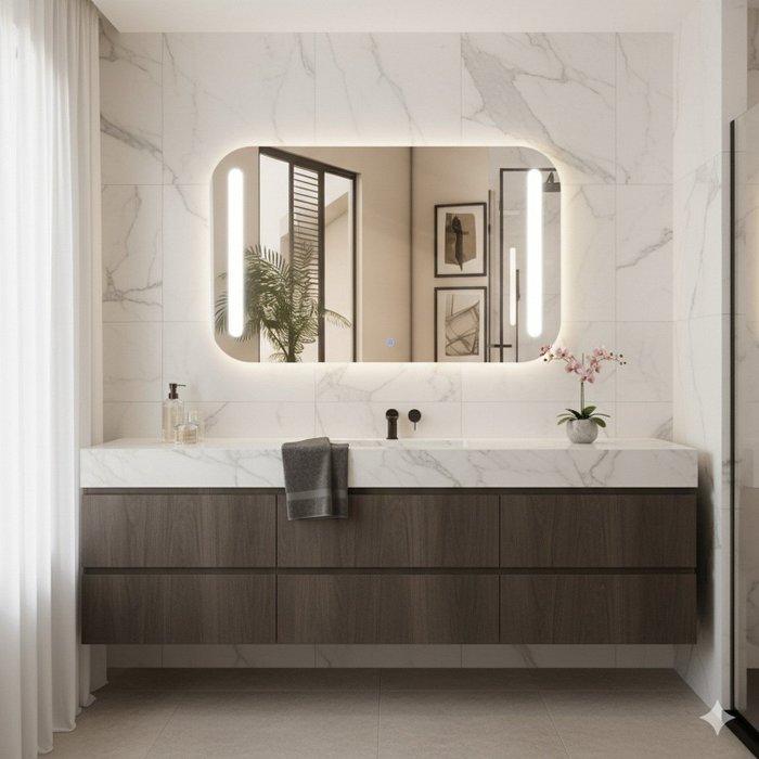 O Espelho Crys combina tecnologia e design para transformar seu ambiente. Com iluminação LED 6000K e sistema touch, oferece luz branca intensa, ideal para maquiagem e cuidados pessoais. Seu design moderno, com cantos arredondados e acabamento refinado, adiciona sofisticação e funcionalidade a banheiros, quartos ou lavabos, valorizando cada detalhe do espaço.