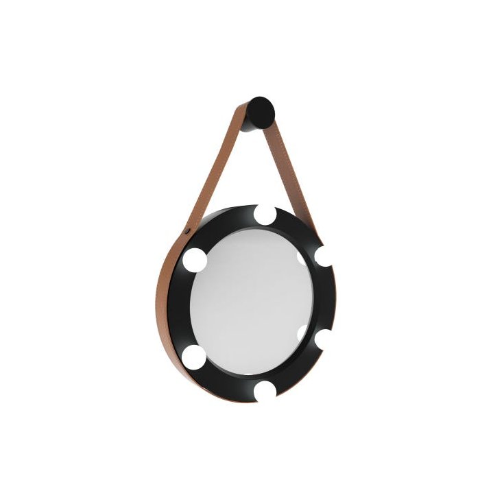 Espelho Camarim Alumínio Aro Preto Cinto Caramelo Diâmetro 60cm para 8 Lâmpadas E27