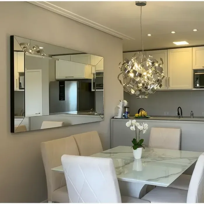 ESPELHO CHANFRADO, MOLDURA COM CORTE EM 45 GRAUS LAPIDADO E ESPELHO CENTRAL COM BISOTÊ.
