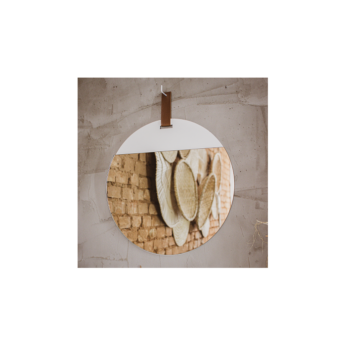 O Espelho Jade foi desenvolvido para trazer mais leveza na decoração do seu lar. Peça minimalista, feita para qualquer ambiente, sofisticação, fino acabamento, peça desenvolvida em formato redondo, modernidade para sua casa, pode ser utilizada no hall de entrada, salas, quartos, banheiros, corredores, enfim para qualquer cantinho da sua casa, renovando o ambiente. Desenvolvido pela Arquiteta Amanda Valencio. Dados Técnicos: - Diâmetro: 40cm - Profundidade: 3 cm - Peso: 900g Especificações: - Espelho Cristal 3mm lapidado - Pintura Cor Branco, com uma camada de seladora. - Tampo mdf 3mm - Alça de couro semi sintético dupla, cor caramelo 10cm - Kit instalação escapula - pino e bucha 6mm Como Conservar: - Limpeza: Deve ser feita com pano macio e seco ou levemente umedecido - Instalação: Recomendado para ambientes internos Outras informações: - Objetos que ambientam as fotos não acompanham o produto