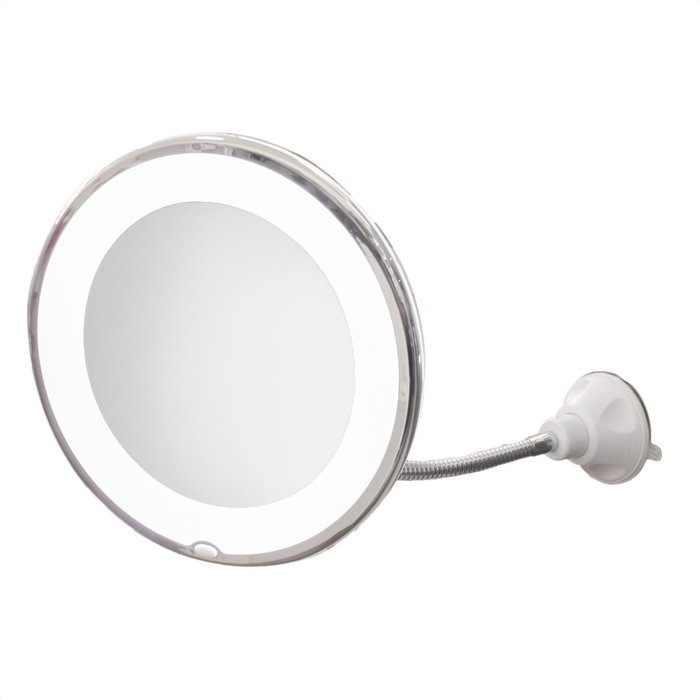 Espelho de aumento, 10x nitidez e foco, com iluminação por led, haste flexível com rotação em todas as direções e ventosa de forte sucção para fixação.