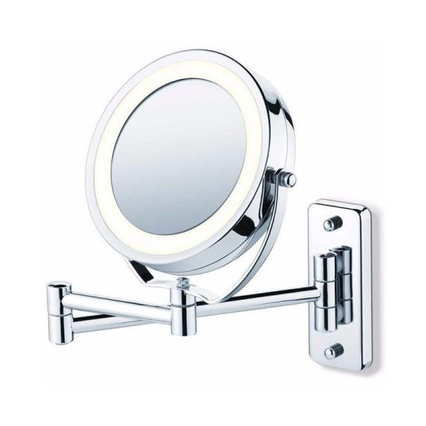 Espelho Giratório Iluminado de Parede e de Bancada - 2 em 1. Pode ser retirado da fixação da parede e colocado em bancada. Movimento giratório dos espelhos. Acabamento cromado de alta qualidade. Diâmetro de 11 cm. Um lado com espelho normal e o outro com aumento da imagem em 5 vezes. Iluminação em LED - clara. De fácil fixação em parede.
